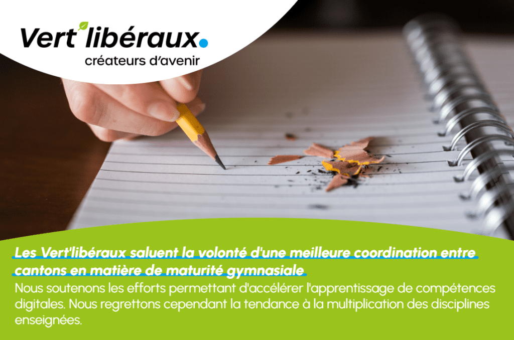 Globalement le parti Vert’libéral salue la volonté de mieux coordonner la qualité de la maturité gymnasiale entre les cantons. Ceci dit, nous regrettons la tendance à la multiplication des disciplines enseignées, entraînant un enseignement plus superficiel (conduisant souvent à faire apprendre des notions par cœur), au détriment d’un enseignement en profondeur d’un nombre plus restreint de disciplines (conduisant à un apprentissage non seulement de la discipline elle-même, mais également de la manière d’appréhender une discipline). Nous regrettons également vivement la tendance très marquée, de réglementer le plan d’études cadres de manière très détaillée. Nous suggérons que la marge de manœuvre des cantons soit aussi grande que possible.