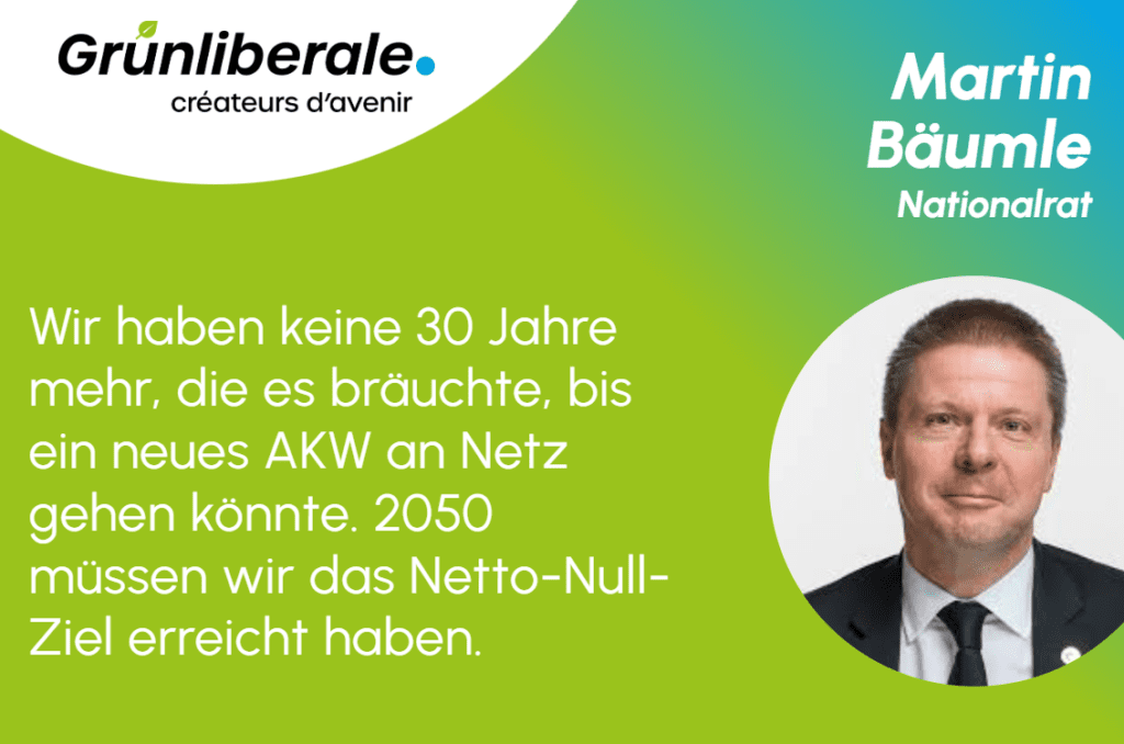 Die Landesregierung missachtet unsere Volksentscheide! Der Bundesrat hat das Umwelt- und Energiedepartement (Uvek) damit beauftragt, bis Ende Jahr den AKW-Neustart zu planen. «Die Grünliberalen wehren sich mit allen rechtlichen Mitteln dagegen und rufen den Bundesrat dazu auf, den vom Volk vorgegebenen Weg nicht zu verlassen», macht GLP-Nationalrat Martin Bäumle klar.