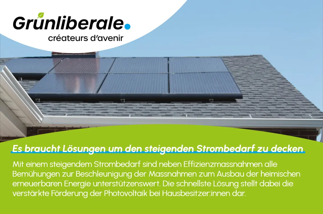 Mit einem Zeithorizont von wenigen Jahren ist die schnellste Lösung die verstärkte Förderung der Photovoltaik bei privaten Investoren, sprich Hausbesitzern. Mit einer sinnvollen und ausreichenden Förderung wird ein grosses privates Investitionspotential aktiviert. Private Flächen sind vorhanden, die Bereitschaft privater Investoren (Hausbesitzer) ist hoch, Verzögerungen durch Einsprachensind eher nicht zu befürchten, nachbarliche Belästigung gibt es in der Regel nicht. Neben einer direkten finanziellen Förderung unterstützen die Grünliberalen vor allem auch Elemente wie die virtuellen ZEVs, die eine Eigenstromproduktion mit einem möglichst hohen Eigenverbrauch attraktiv machen.
